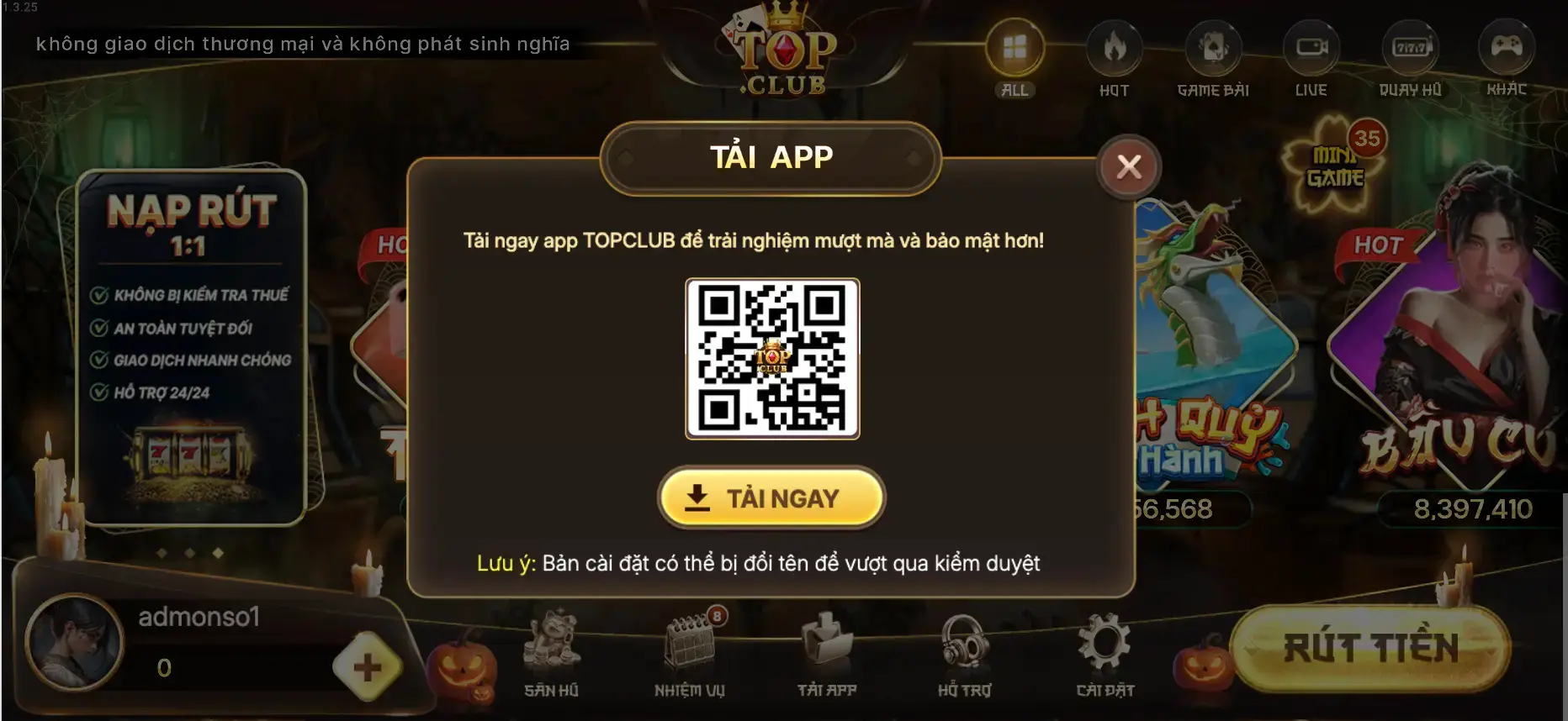 Để trải nghiệm game mượt mà và tiện lợi nhất, hãy tải ứng dụng TOP CLUB về thiết bị di động của bạn. Ứng dụng được tối ưu hóa dung lượng, tương thích hoàn hảo với cả hệ điều hành iOS và Android.